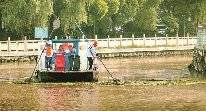 7月21日,如东县环卫部门组织人员在如泰运河打捞暴雨冲刷带来的水面杂物。 顾华