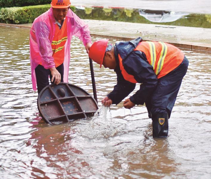 7月7日,暴雨后,如皋市政管理处工作人员在受淹道路清理窨井杂物。 吴树建