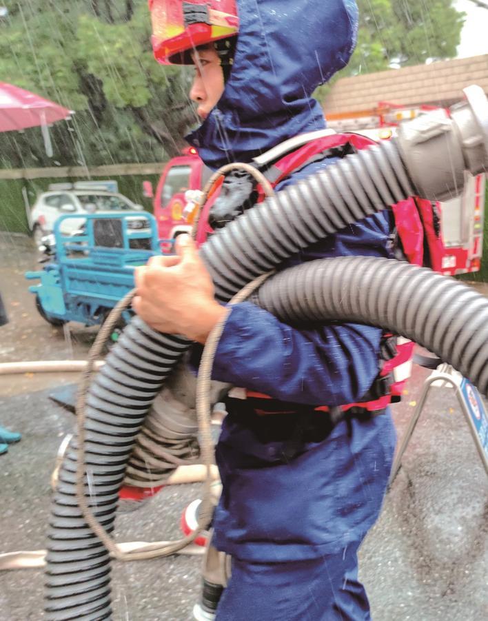 7月19日上午,暴雨不停,市区三八新村内涝严重,天生港消防救援站出动人员冒雨排涝,一名队员脚步匆匆运送物资。 任佳楠 王德泉