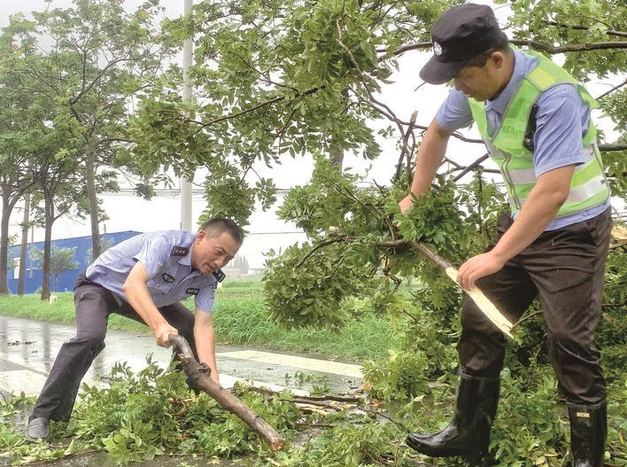 7月6日,海安南莫交警中队民警顶风冒雨清障保畅。 周强 朱建华
