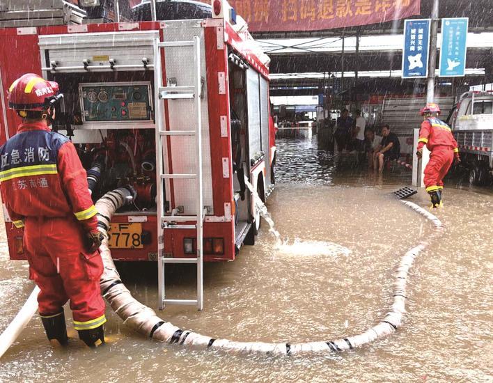 7月20日,启东东海专职消防救援队在新安镇菜市场进行排涝作业。 肖方