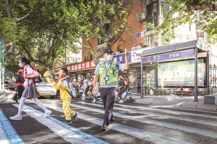 9月1日晨,通师二附东门护学岗,民警为孩子们平安入校保驾护航。 侯天骄 摄