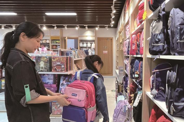8月29日,海门新华书店,家长带着孩子挑选新书包。 施敏 摄