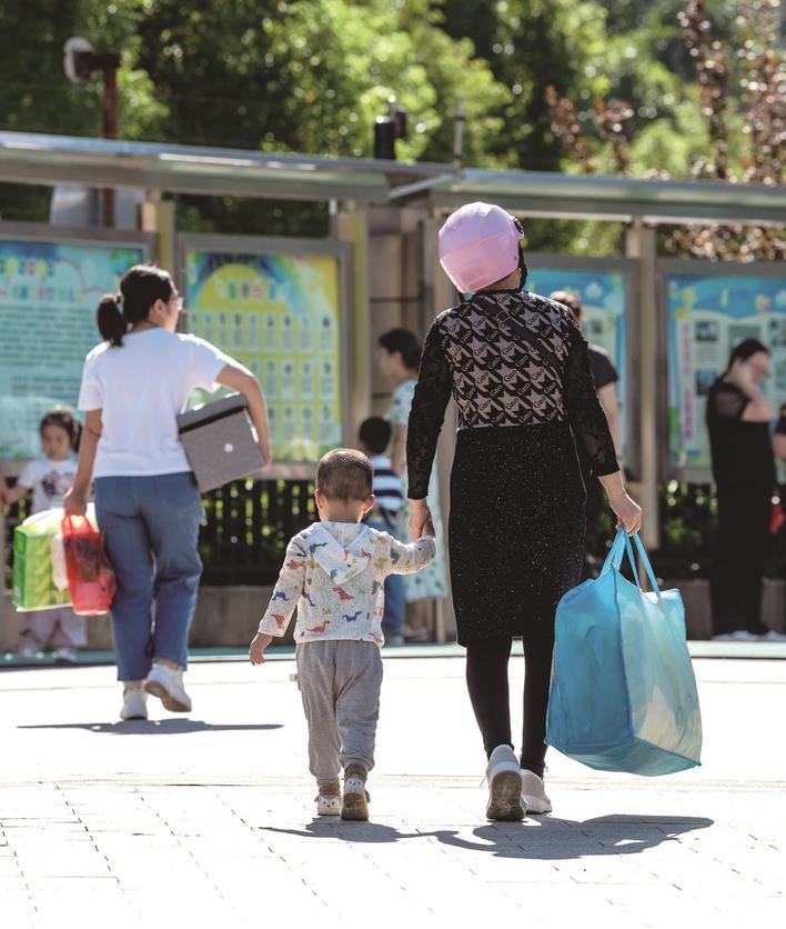 9月1日,永兴幼儿园门前,奶奶一手拎着被子一手搀着孩子到幼儿园报到。 袁德君 摄