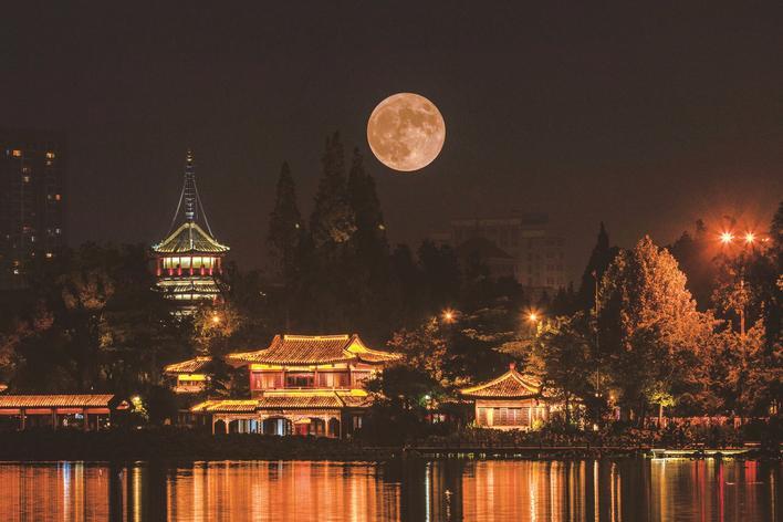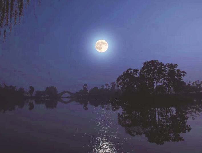 ▲ 中秋夜,一轮圆月升起在市区紫琅湖上空,在湖面洒下清辉一片(二次曝光)。 黄红军