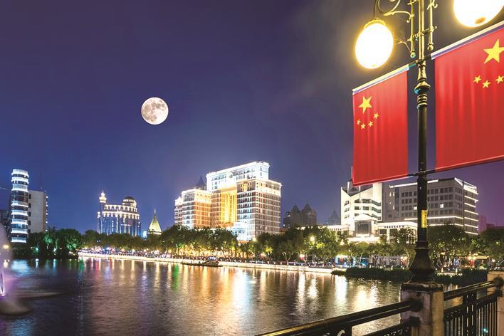▲ 中秋夜,市区濠河边文化宫桥上拍摄的圆月。彭常青