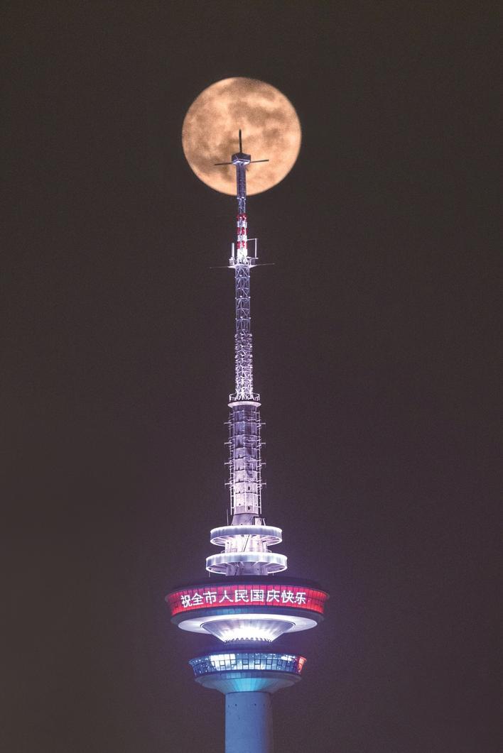 ▲中秋夜,一轮圆月升起,与南通电视塔合影(二次曝光)。 孔玮