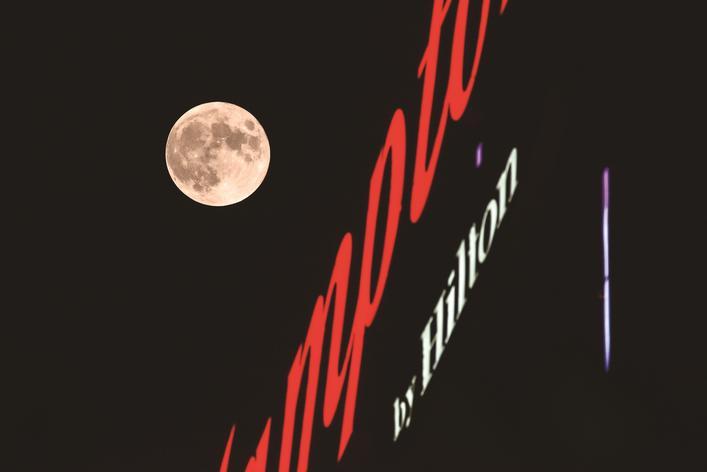 ▲ 中秋夜,一轮圆月从江海大道旁一家酒店的店招霓虹旁升起。 陈德军