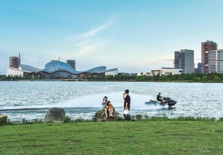 10月1日,紫琅湖上快艇飞驰而过,游客在湖畔拍照。陈德军