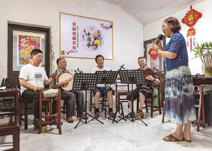 7月27日,通州区石港镇广济桥社区,几名老戏迷聚在一起过戏瘾。黄旭