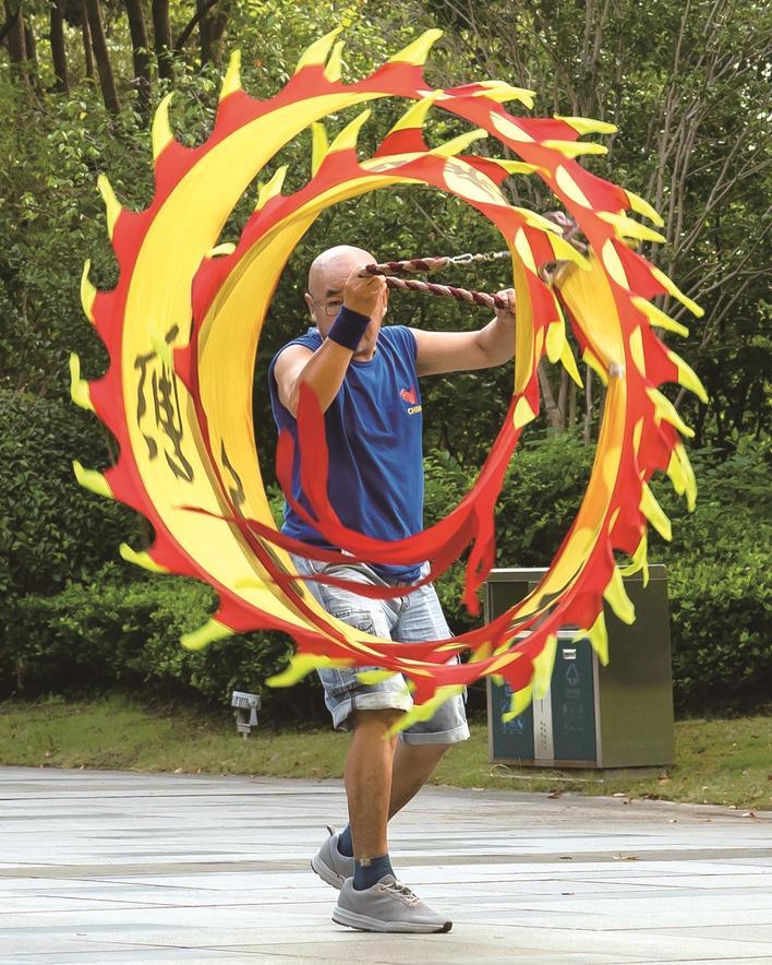 八月十八日早上,南通市开发区能达公园,一名老人在舞龙健身。 冯周鼎