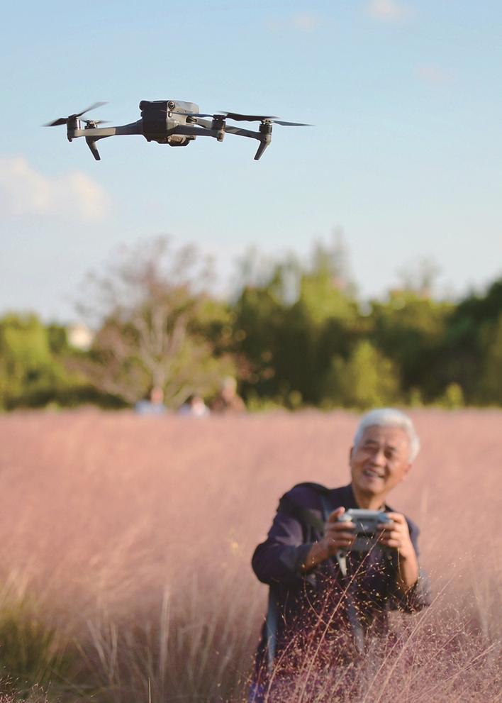 10月20日,启东市江天生态园内粉黛乱子草盛开,一名老人带着无人机前来打卡。姜新春