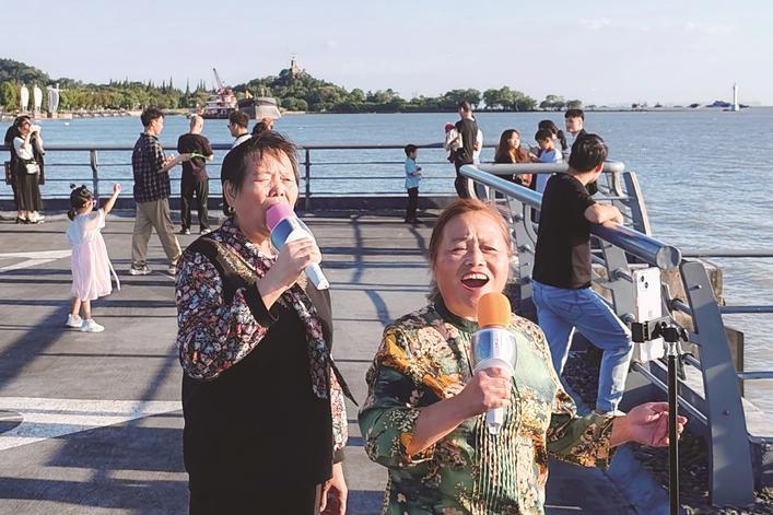 10月4日,俩老人在滨江公园一展歌喉。 瞿德均