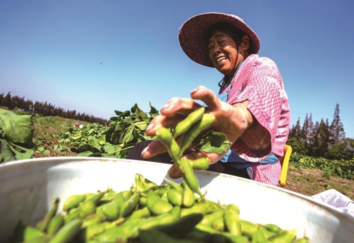10月31日,南通江心沙农场毛豆丰收,农民们喜收豆荚。 钱伟章