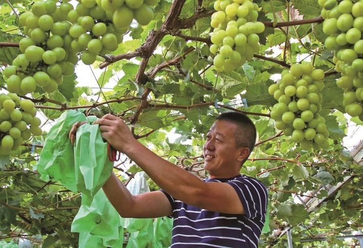 9月19日,南通老兵情怀农场负责人季华在葡萄大棚里给成熟葡萄套袋。 李斌
