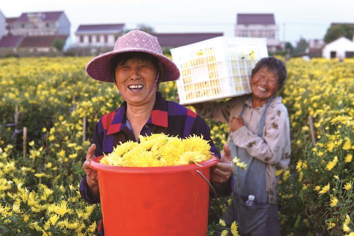 10月26日,启东市惠萍镇士连村200亩金丝皇菊进入采收期,村民在田间采摘菊花。姜新春