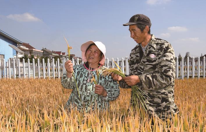 10月26日,通州区兴东街道双楼村学建家庭农场,王学建夫妇在田头观察稻穗,评估收成,满脸喜悦。 顾学锋