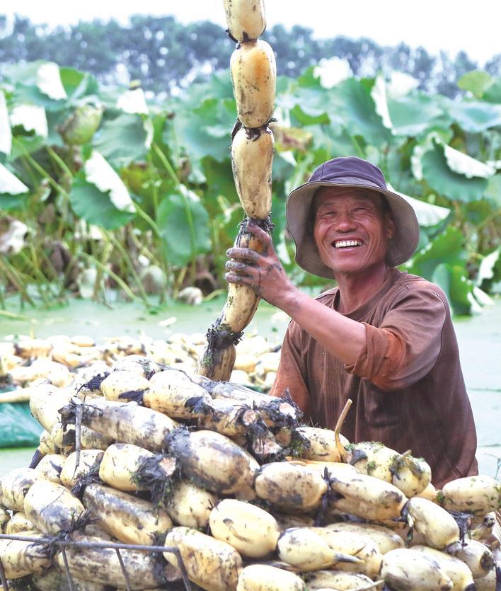 9月20日,海安市墩头镇新舍村,农民正在藕田里采收浅水藕,脸上洋溢着丰收喜悦。周强