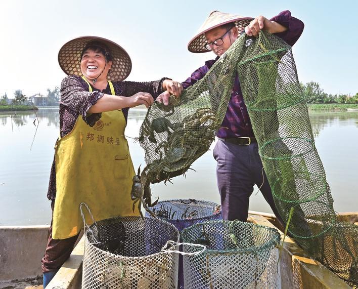 10月19日,通州区石港镇四港村,螃蟹养殖户殷国梁及其帮手们在起网捕蟹时喜笑颜开。 丁传彬