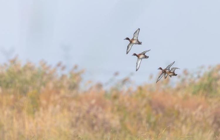 11月26日,如皋长青沙,一群青头潜鸭从芦苇深处扑翅飞起。 陆信