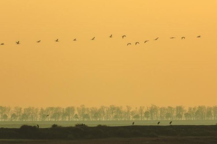 11月27日,启东江边,一行鸟儿掠过防护林带上空。黄是春