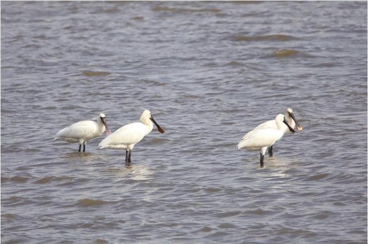 11月5日,通州湾,几只黑脸琵鹭和白琵鹭的倩影出现在滩涂上。陈欣欣