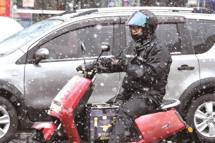 12月18日,崇川区永扬路,大雪中送外卖的小哥。 袁德君