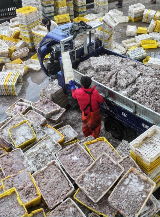 11月10日,启东吕四渔港码头一片热闹景象,渔民们忙着卸运、分类处理刚刚到港的多种新鲜海产品。
