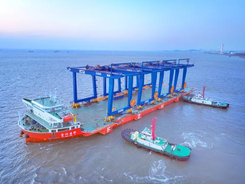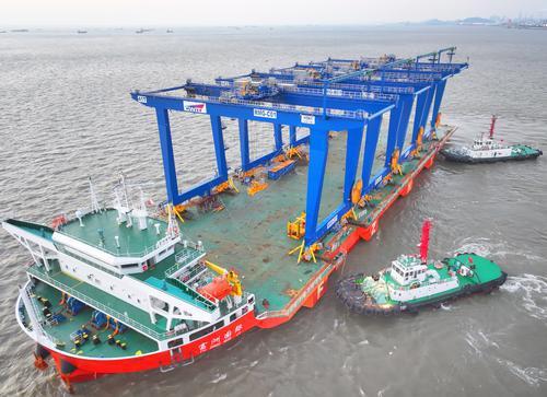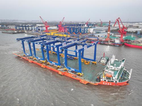 12月14日,“富洲国际”船装载着斯里兰卡4台自动化轨道吊驶离振华重工南通分公司码头,前往科伦坡西港。