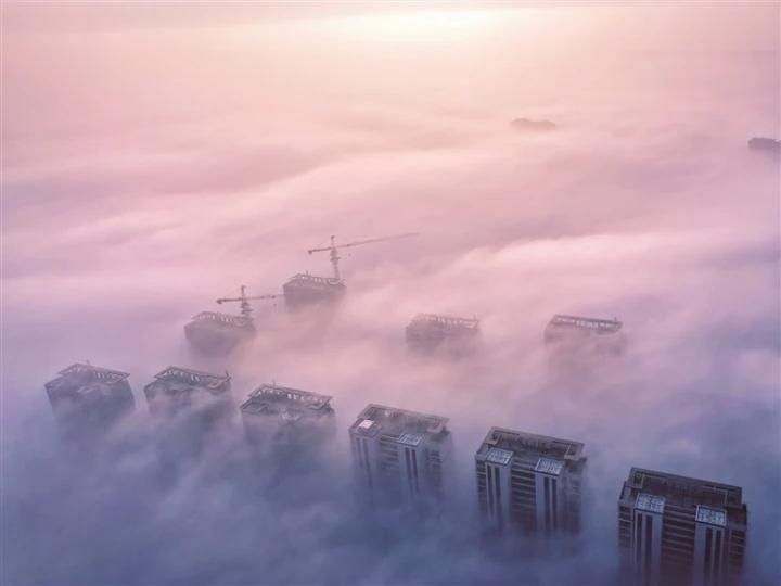 1月6日清晨,如皋市区,无人机穿越平流雾拍下美丽城景。 邹勇