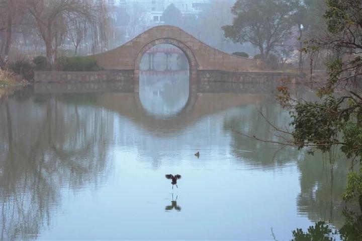 1月4日晨,市区青年路小公园,一只水鸟踏波振翅。 蒋红霞