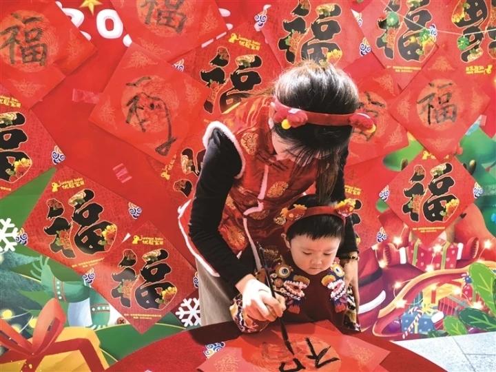 2023年12月31日,市区一家教育机构的老师教小朋友写福字。 瞿德均