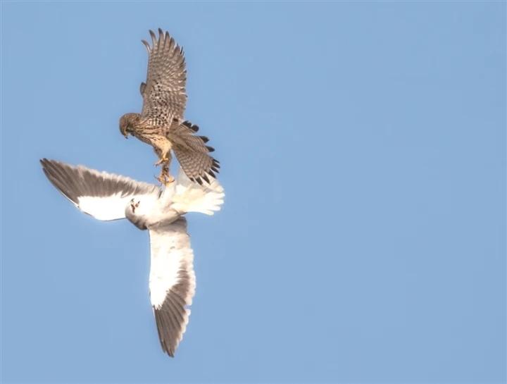 1月12日,市区滨江大桥附近上空,一只黑翅鸢和一只红隼展开格斗。 葛锦平