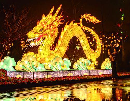 1月31日,市经开区能达公园内,一条金色灯龙栩栩如生,引来市民驻足打卡。冯周鼎