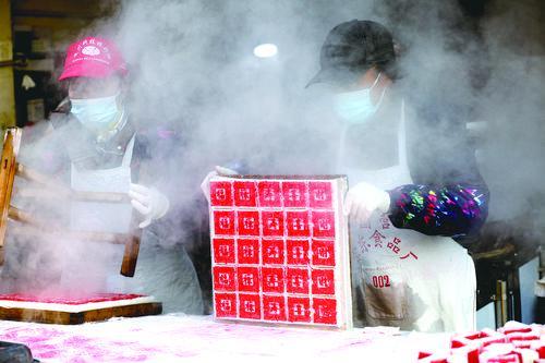 1月28日,海门区余东镇一家加工红印糕作坊里,热气腾腾,师傅们忙着蒸红印糕,满足居民过年需求。王亚东