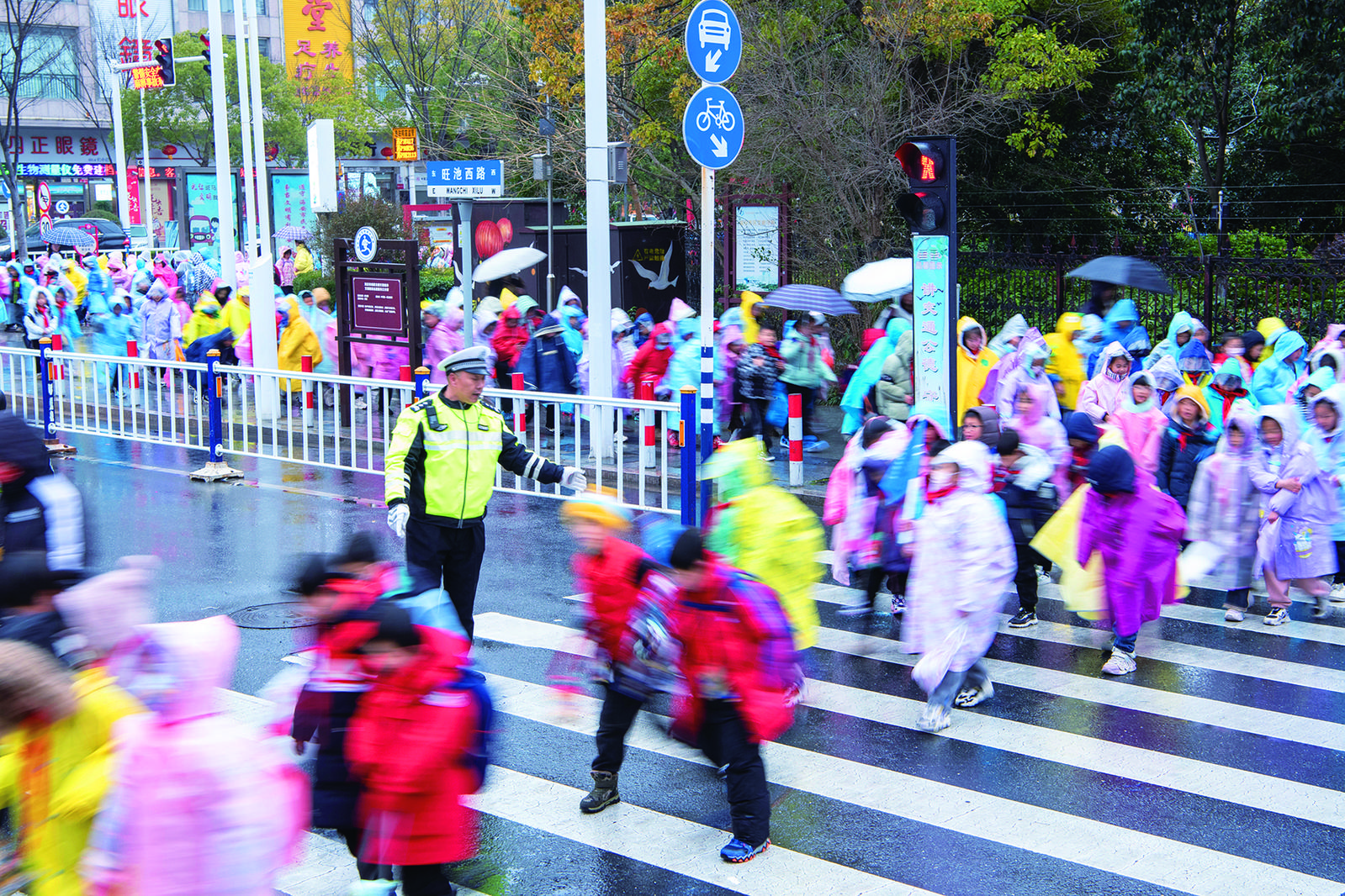 二月二十二日,海安市交警雨中导护小学生放学过马路。徐劲柏