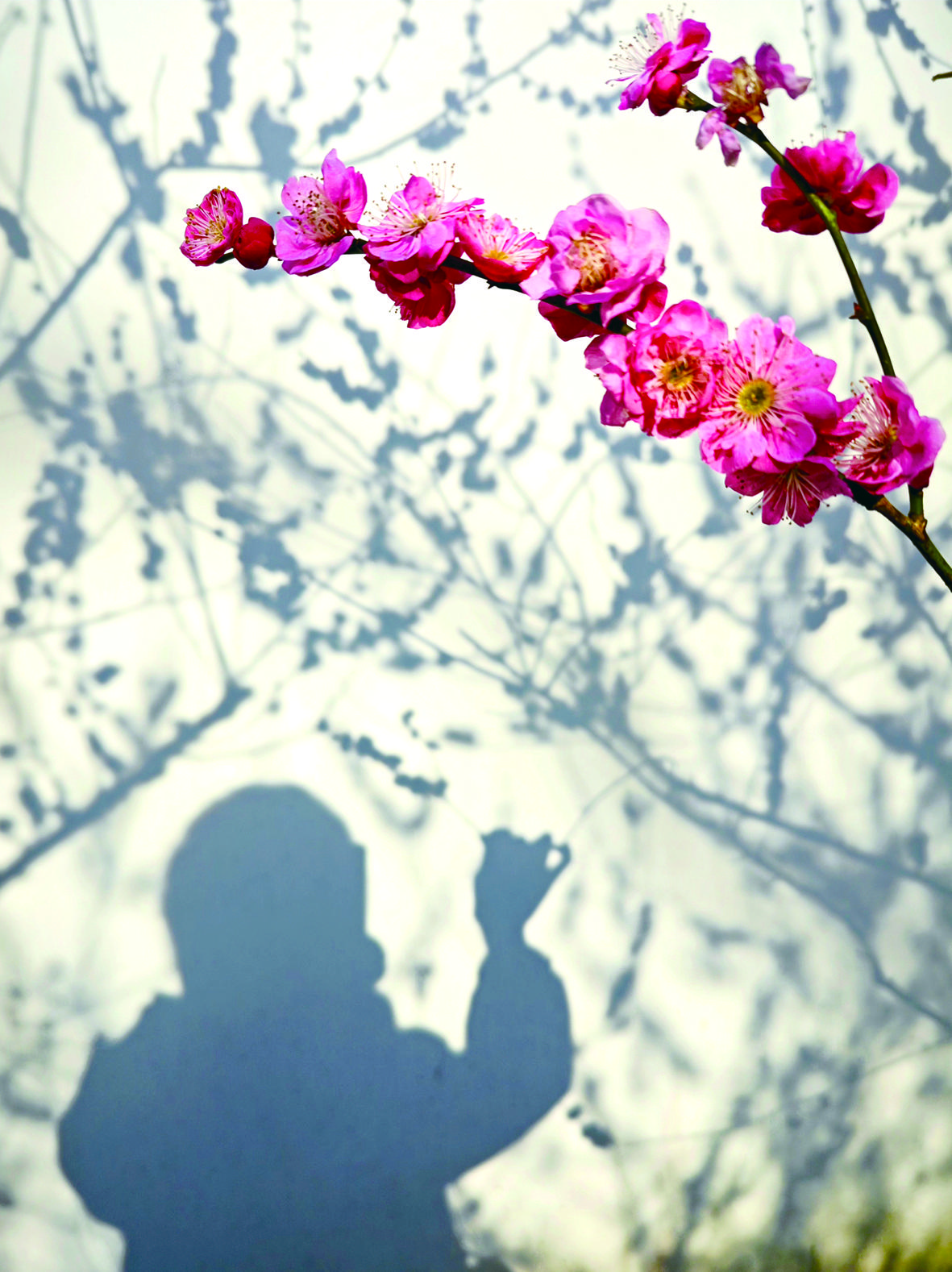 2月28日,通城一隅,市民在梅枝下、墙壁上留下剪影。静影