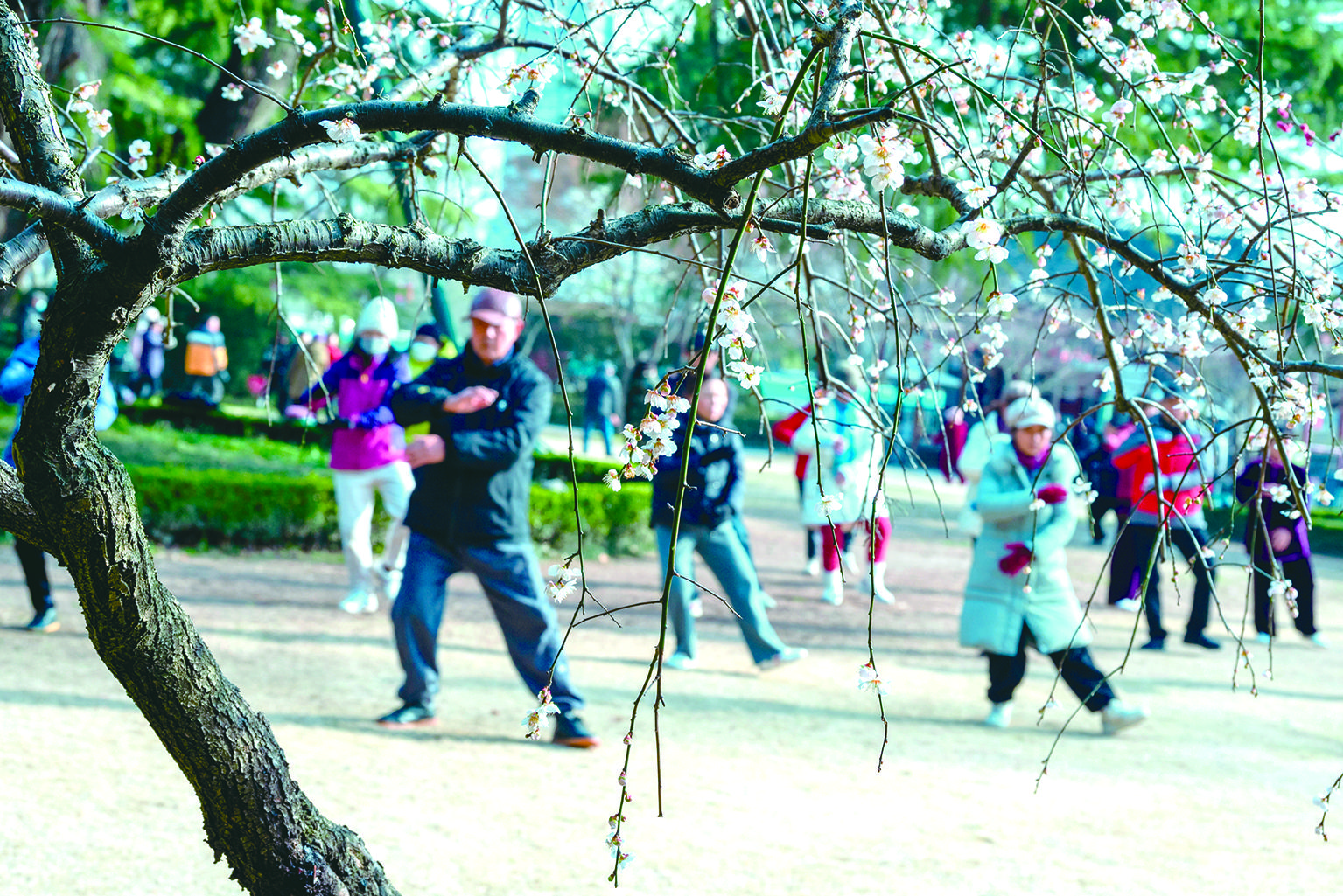 2月27日,市民在南通博物苑内的梅花树下练习太极拳。蒋红霞