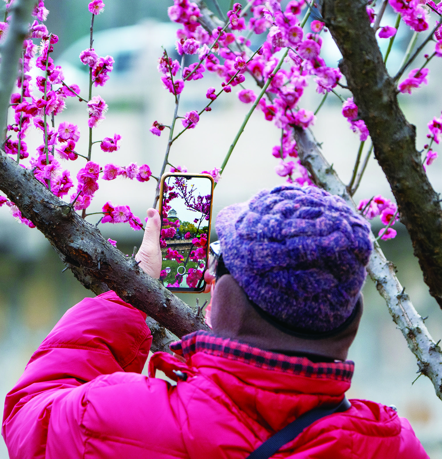 3月1日,一名摄影爱好者在市区怡园内拍摄梅花。 袁建