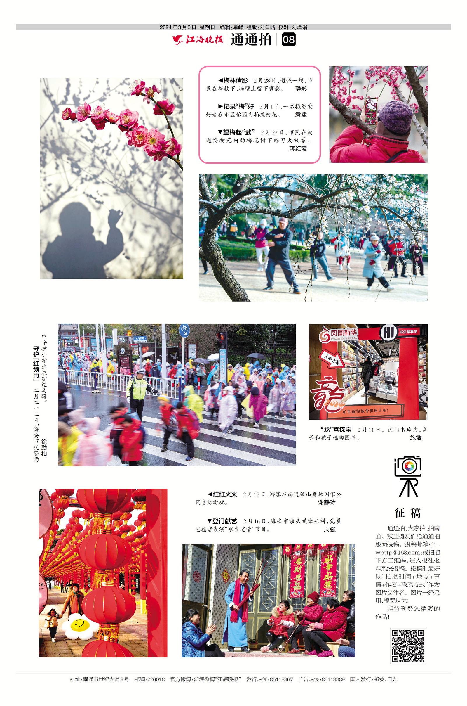通通拍,大家拍、拍南通。欢迎摄友们给通通拍版面投稿。投稿邮箱:jhwbttp@163.com;或扫描二维码,进入报社报料系统投稿。投稿时最好以“拍摄时间+地点+事情+作者+联系方式”作为图片文件名。图片一经采用,稿费从优!