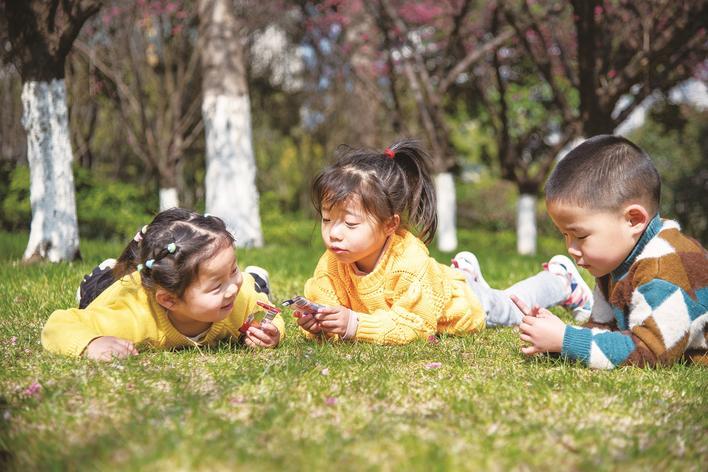 3日,南通经开区能达中央公园内,孩子们趴在草坪上玩耍。黄平华 摄
