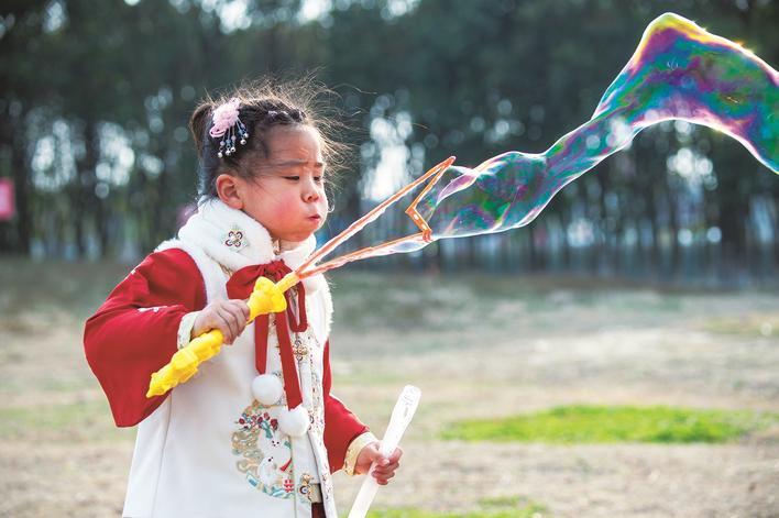 3日,海安市七星湖生态公园,小姑娘在吹泡泡。徐劲柏 摄
