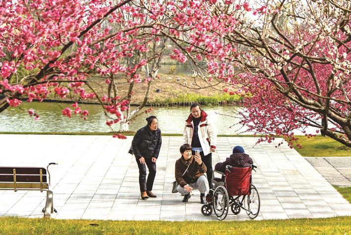 8日,紫琅湖公园,一家人在梅花树下为老人拍照留念。冯周鼎 摄