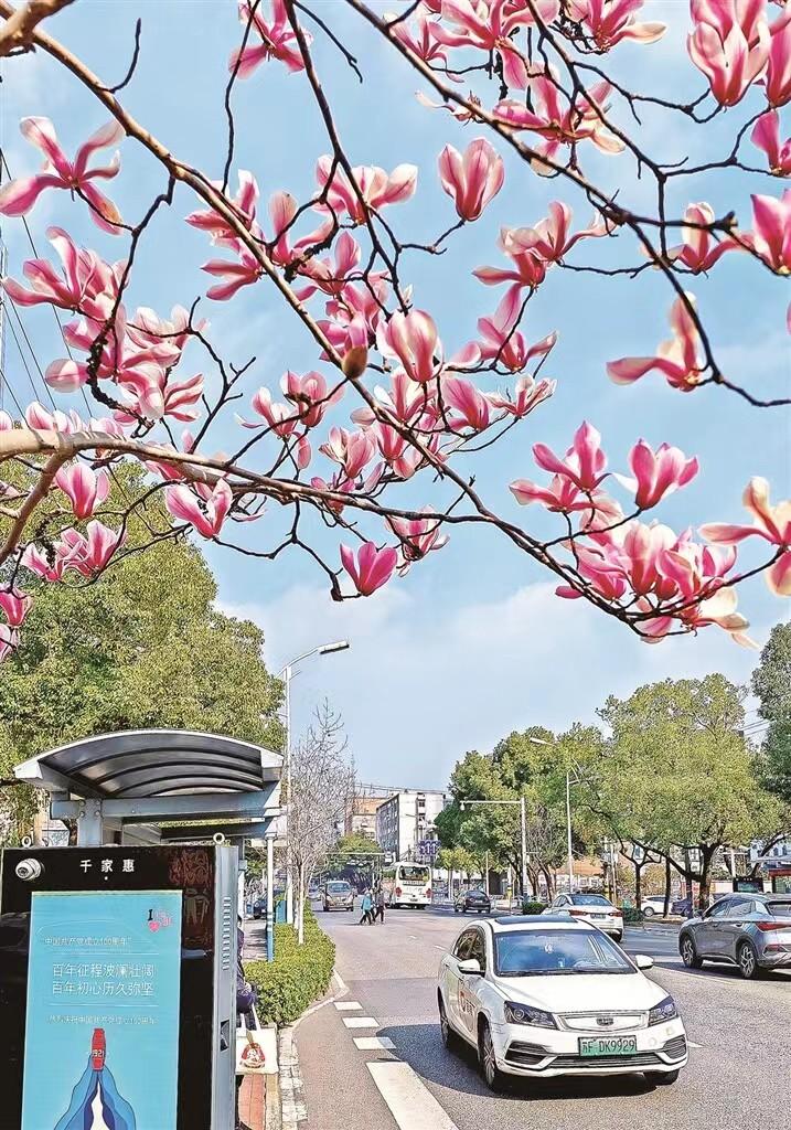 12日,蓝天白云,市区青年西路两边的玉兰花绽放,组成一幅优美图画。玄妙 摄