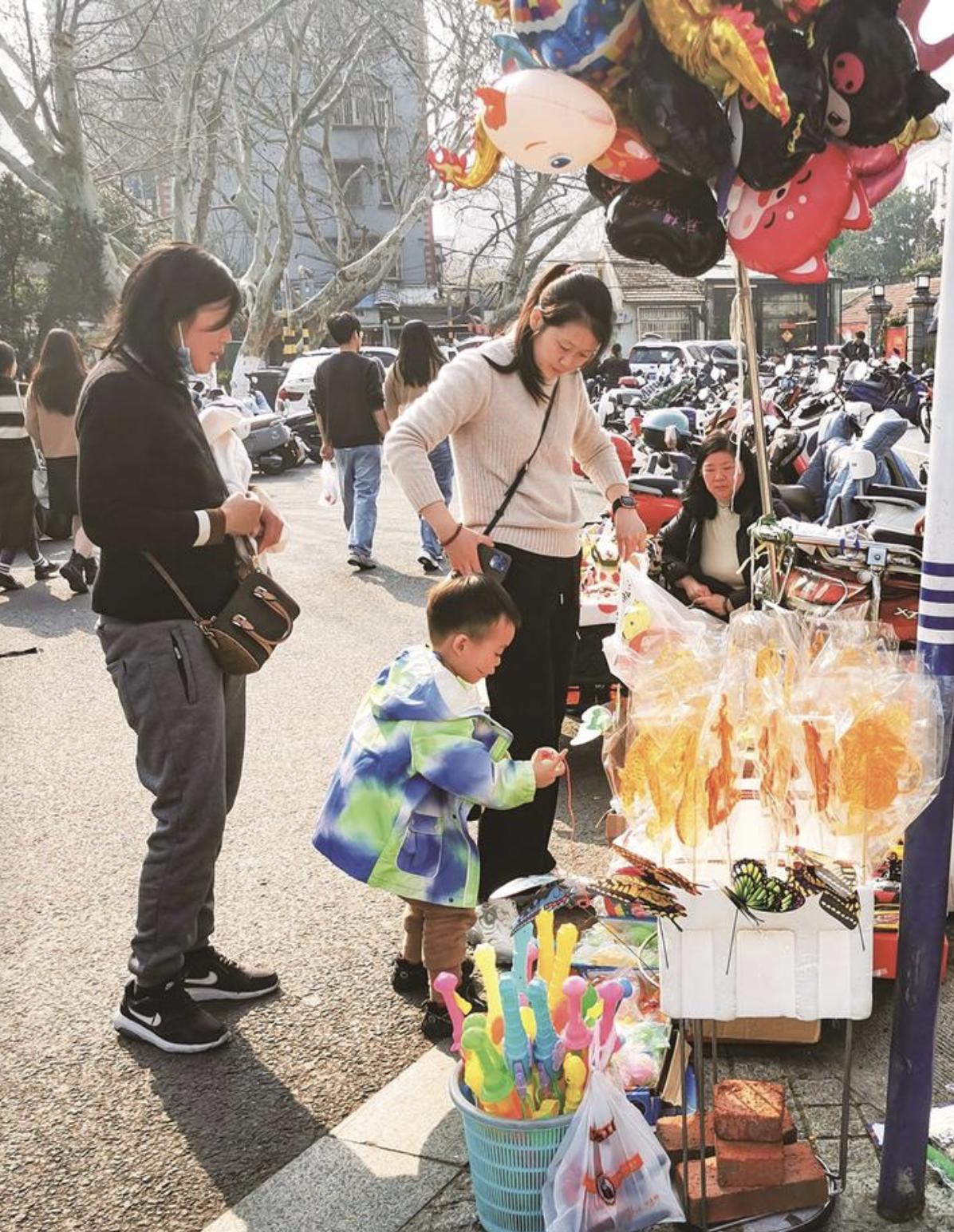 十六日,南通博物苑门前小摊,家长陪孩子挑选玩具。余泽垠 摄