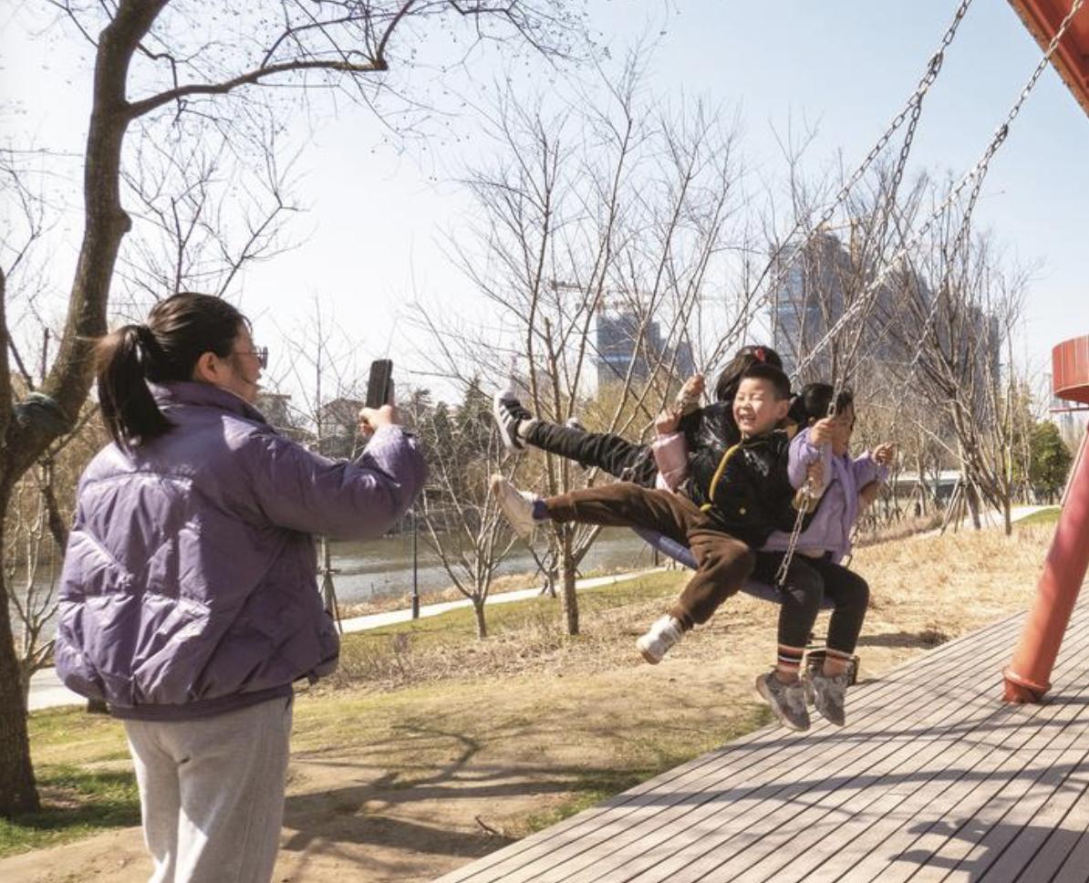 10日,孩子们在家人的陪同下在海安通扬河生态区游玩。徐劲柏 摄