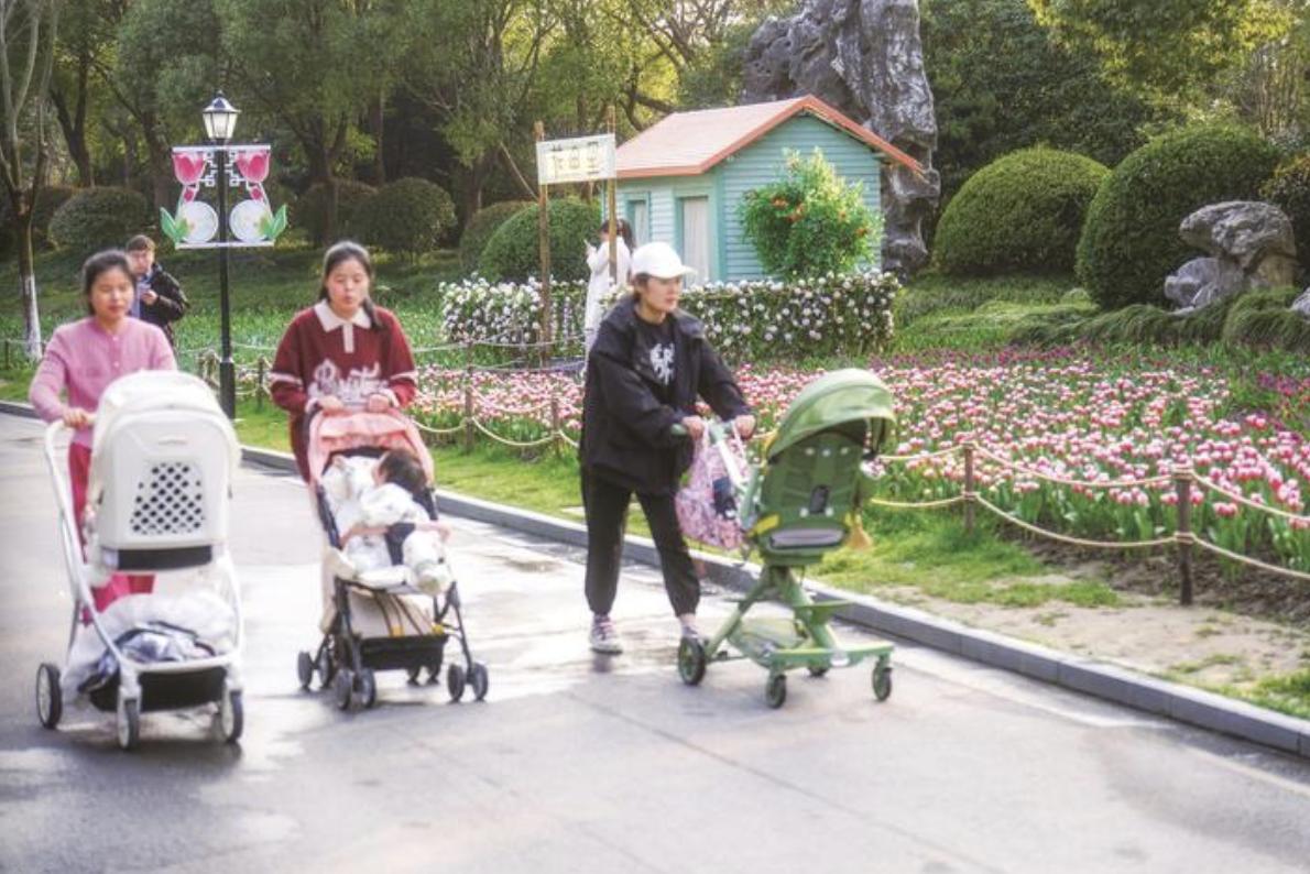 15日,市区啬园景区,妈妈们推着婴儿车带娃出来享受春光。杨大业 摄