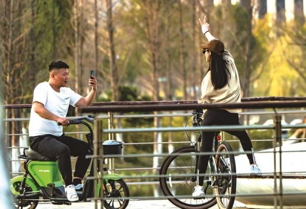 22日,紫琅湖公园,一男子给骑行女子拍照。冯周鼎