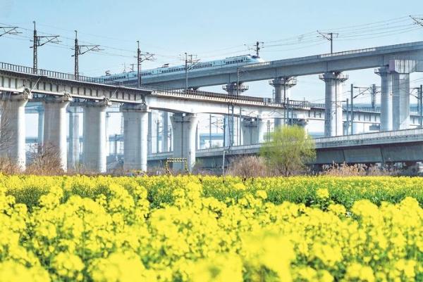 17日,崇川区陈桥街道,一列高铁掠过春天的田野。蒋红霞