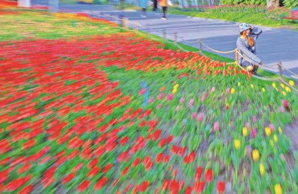 21日,啬园,一名少女在郁金香花地边留影。刘建宁